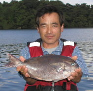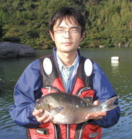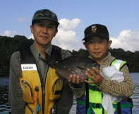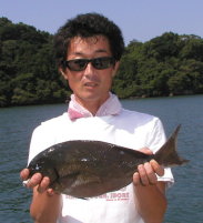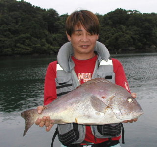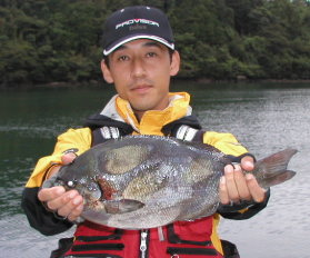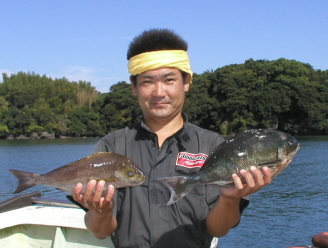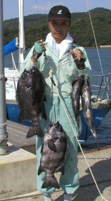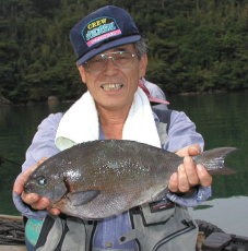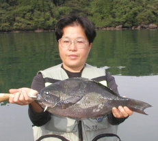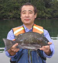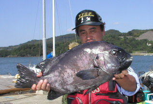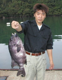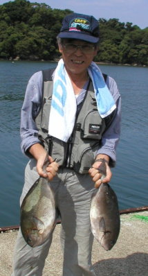西瀬1番での850gのイサキと 1.3kgのクロを持ってにっこりの 松本さんです。 |