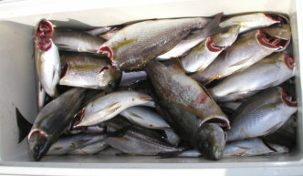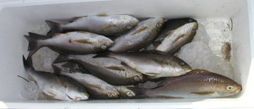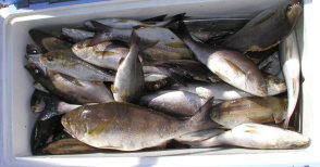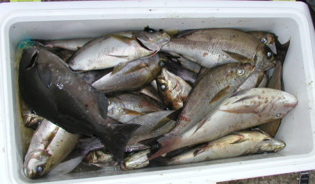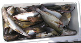 | 松本さんのクーラーです。かなり大型のイサキも混じっています。 | 西瀬4番の園山さんのクーラーです。全部デカイ! |