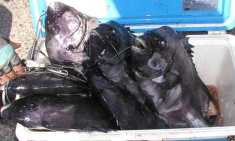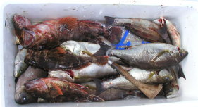 | 本田さんは大立西のハナでキロ以上のクロを4-5枚釣っていました。一番大きかったのは1.3kgでした。 | 本田さんのクーラーはいつでも重たいです。 クロ以外にもイサキ、アコウ他いっぱいつまっていました。 |