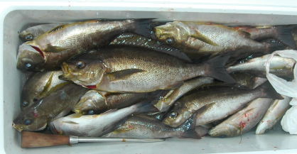西瀬ではあさからいわし系ホッパー(海面で音を立てるルアー)で 3回当たりがあった鎌田さんの釣果。バラした2匹は結構大きかった そうです。 |